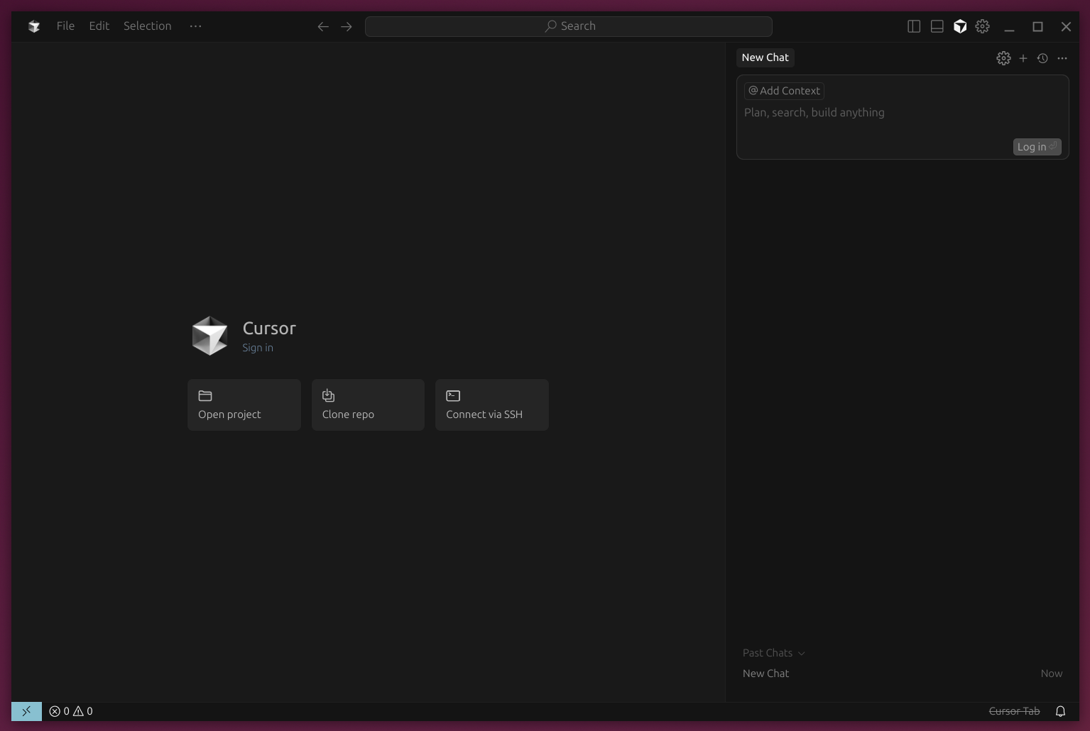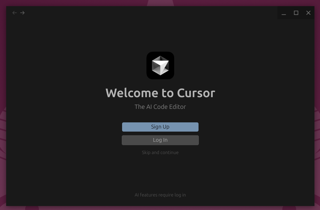 Cursor AI를 실행하면 먼저 시작 화면이 나타납니다. 화면 중앙에는 Cursor 로고와 함께 "Sign in" 텍스트가 보이고, 그 아래 세 가지 옵션이 나타납니다: