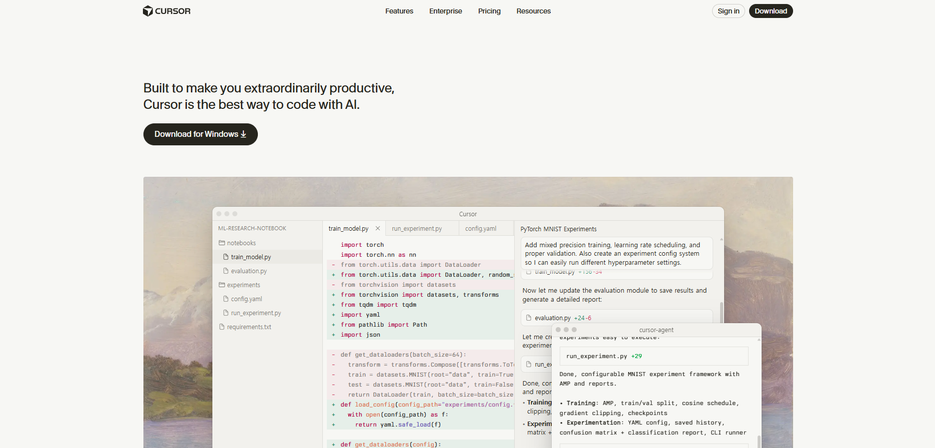 - 코드 자동완성(Tab) + 대화형 AI(Agent) + 파일 단위 수정 지원