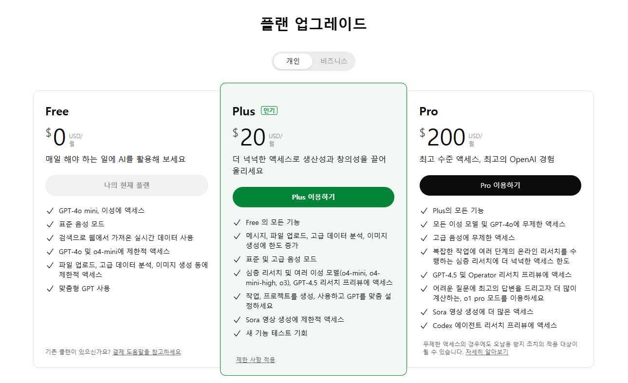 - 유료 플랜: 더 많은 사용량과 최신 모델 접근 가능