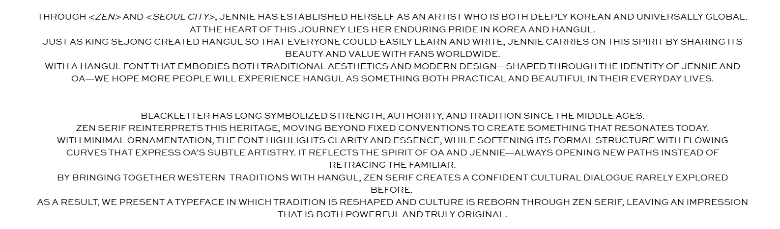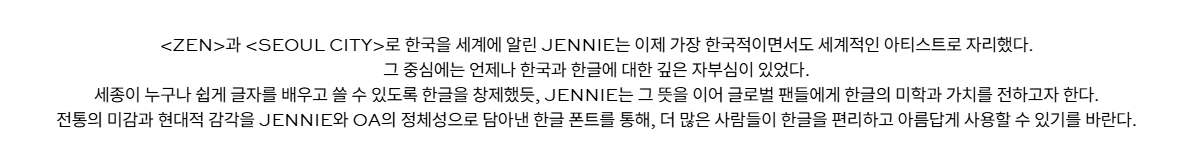 제니의 앨범 수록곡 'Zen'과 'Seoul City'로 한국을 세계에 알린 것처럼, 이번에는 한글폰트를 통해 한글의 아름다움을 전하고자 합니다. 세종대왕이 누구나 쉽게 글자를 배우고 쓸 수 있도록 한글을 창제했듯, 제니는 그 뜻을 이어 글로벌 팬들에게 한글의 미학과 가치를 전하고자 했습니다.