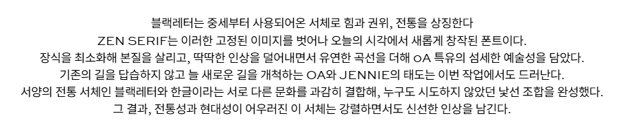 블랙레터는 중세부터 사용되어온 서체로 힘과 권위, 전통을 상징합니다. 젠 세리프는 이러한 고정된 이미지를 벗어나 오늘의 시각에서 새롭게 창작된 폰트입니다. 장식을 최소화해 본질을 살리고, 딱딱한 인상을 덜어내면서 유연한 곡선을 더해 OA 특유의 섬세한 예술성을 담았습니다.