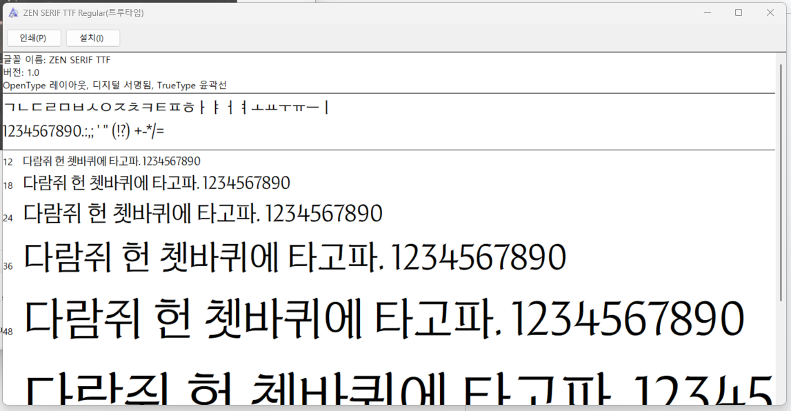 또 다른 방법으로는 제어판에서 '글꼴' 폴더를 열고, 다운로드한 폰트 파일을 해당 폴더에 드래그 앤 드롭하는 방식도 있습니다. 설치 후 워드, 포토샵, 일러스트레이터 등 모든 프로그램에서 'ZEN SERIF'라는 이름으로 사용 가능합니다.