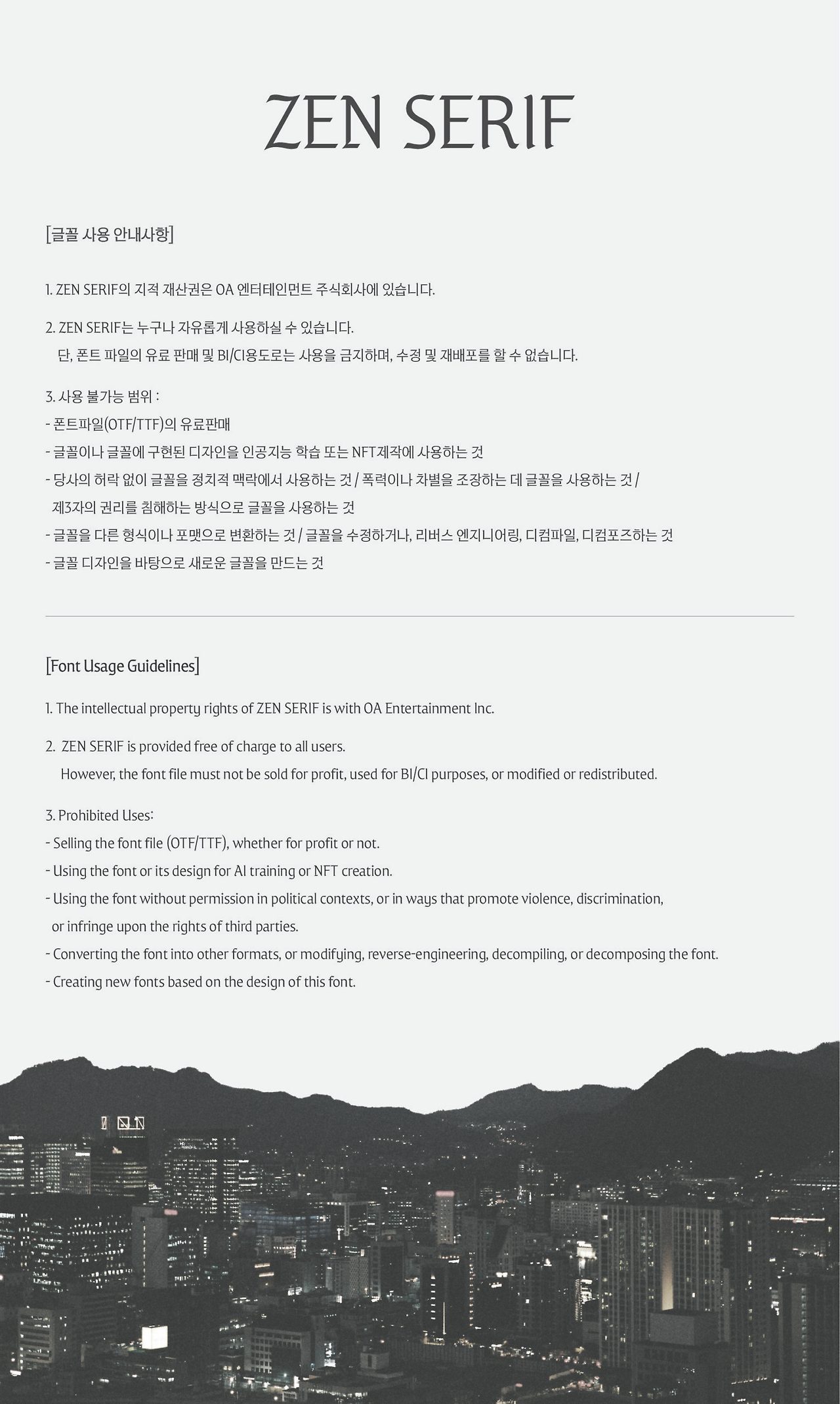젠 세리프의 저작권은 OA엔터테인먼트가 소유하고 있습니다. 모든 사용자에게 무료로 제공되지만, 다음과 같은 제한사항이 있습니다.